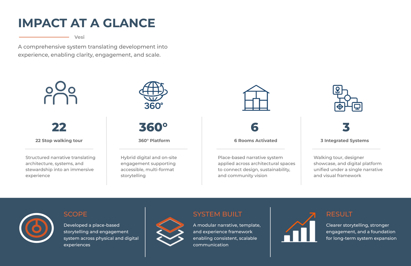 At the same time, Vesi needed to engage diverse audiences across multiple formats, including in-person tours, digital platforms, and partnership materials. Without a cohesive system, each interaction risked becoming fragmented, limiting both understanding and momentum.